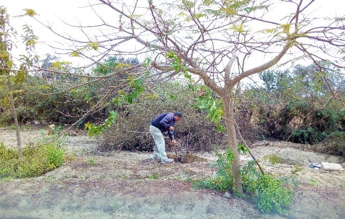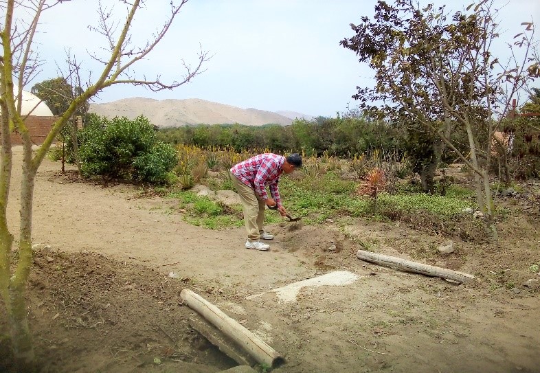 Son muchísimas las tareas que hay que realizar periódicamente en el Parque. La limpieza de los canales que se colmatan requiere de trabajo permanente para que el agua de riego siga su curso. Se puede ver a Lucho en la siguiente foto de voluntario en dicha tarea.
